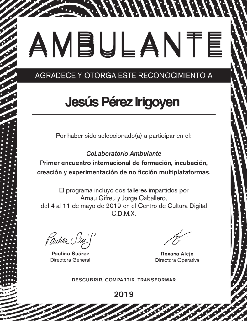 AMBULANTE in collaboration with Salón Transmedia, created Colaboratorio, a training space as part of the activities of their festival focusing in new narratives for documentaries. It is an incubation meeting to develop, produce and disseminate transmedia audiovisual narratives that will take place from May 4 to 11 in the Digital Culture Center (CCD) of Mexico City.