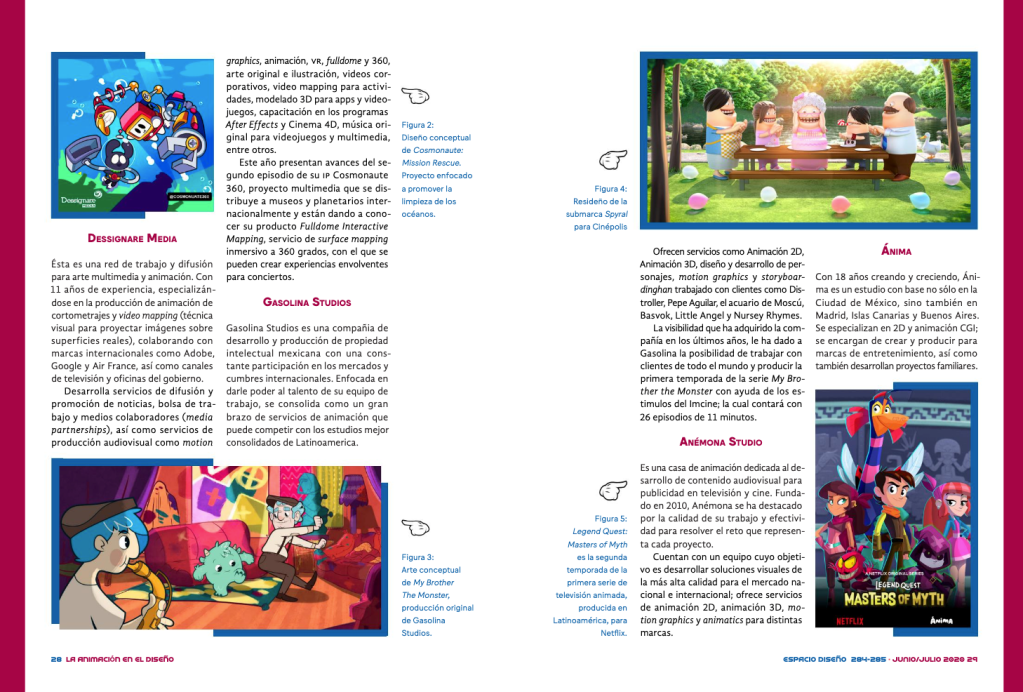 In the july issue of espacio diseño, Dessignare Studio is featured alongside Cinema Fantasma, Gasolina Studios, Ánima Studios and other great companies in a top ten list reviewing mexican creators from Mexico City with a relevant presence in the international markets.