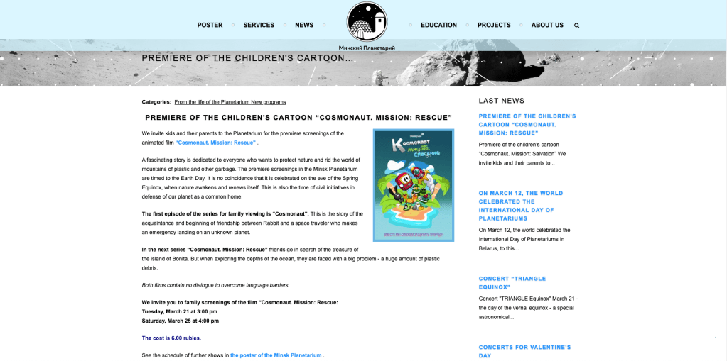 Children and their parents are invited to the Minsk Planetarium for the premiere screening of the animated film “Cosmonaute 360 – Mission : Rescue” produced by Dessignare Studio.