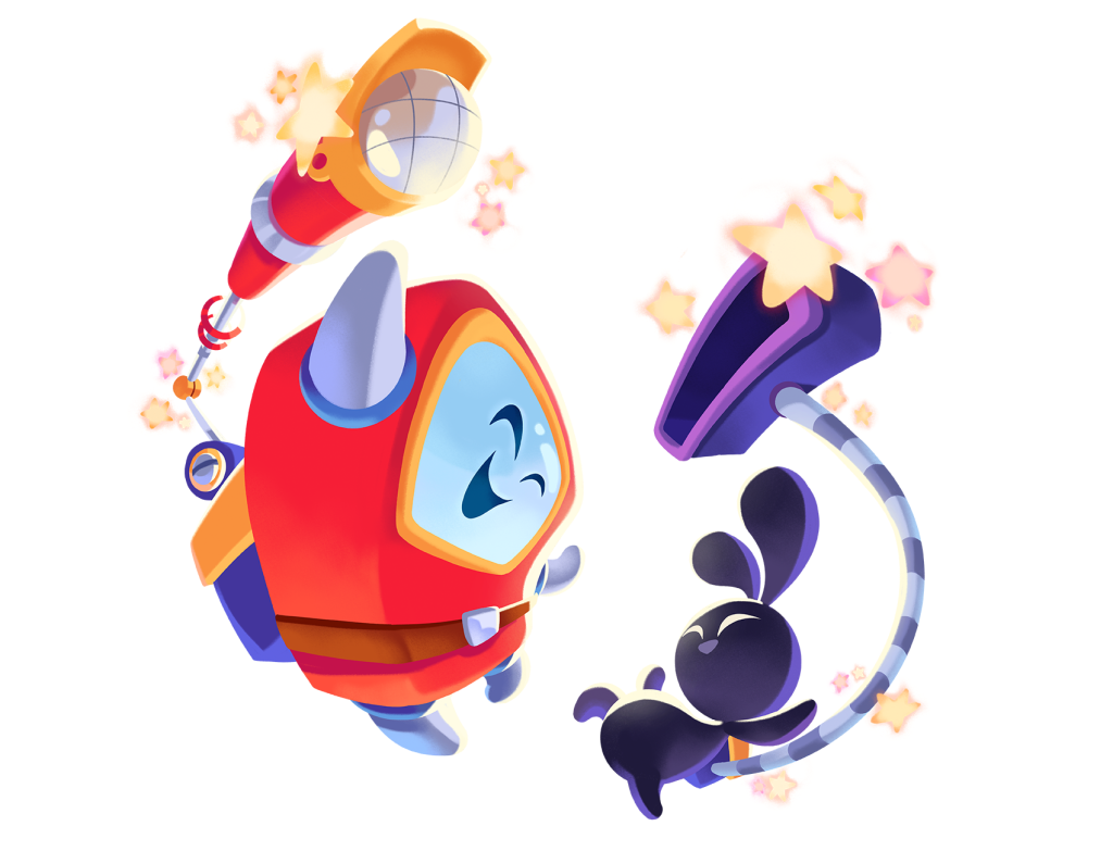 Adventurous, kind, noble, always smiling. His body shape recembles a marshmallow. Many confuse it with a robot or a television. This character represents curiosity (wanting to know more and understand how things work), seeks to inspire children to become creators who can express their ideas through art and science, whether they are engineers, scientists or film directors!